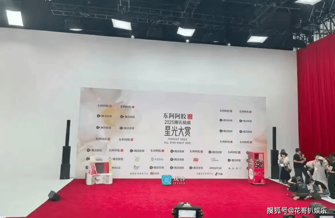场地狭窄就算了,广告商都招不来几个。往年星光大赏的舞台要么华丽璀璨,要么设计感十足,今年却简陋到让人怀疑经费被克扣了,舞台面积缩水一半,背景板只有简单的LED屏循环滚动,灯光打出来惨白刺眼,把艺人的高定礼服照得像地摊货,廉价感隔着屏幕都挡不住。更离谱的是红毯区域,不仅布景单薄到一推就倒的既视感,连红毯本身都是用胶带临时粘在地上的,边缘起翘。